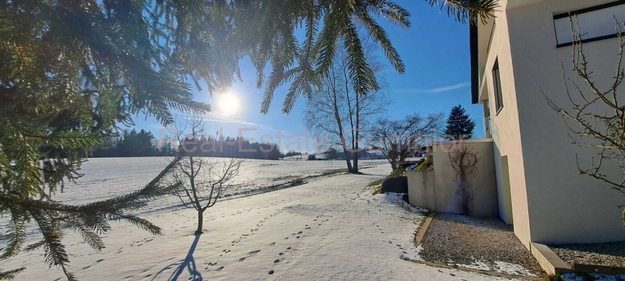 Das traumhafte Grundstück, mit schattenspendenden Fichten, gestaltet zu einer minimalistischen Parkanlage, liegt mitten im Grünen. Die Vielfalt